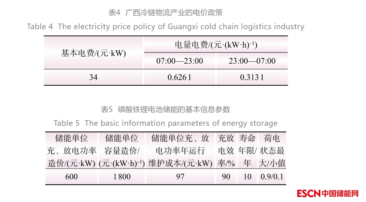 廣西冷鏈物流農產品產業(yè)享受電價優(yōu)惠,其分時電價政策[26]如表4所示。儲能系統(tǒng)的基本信息參數(shù)如表5所示。