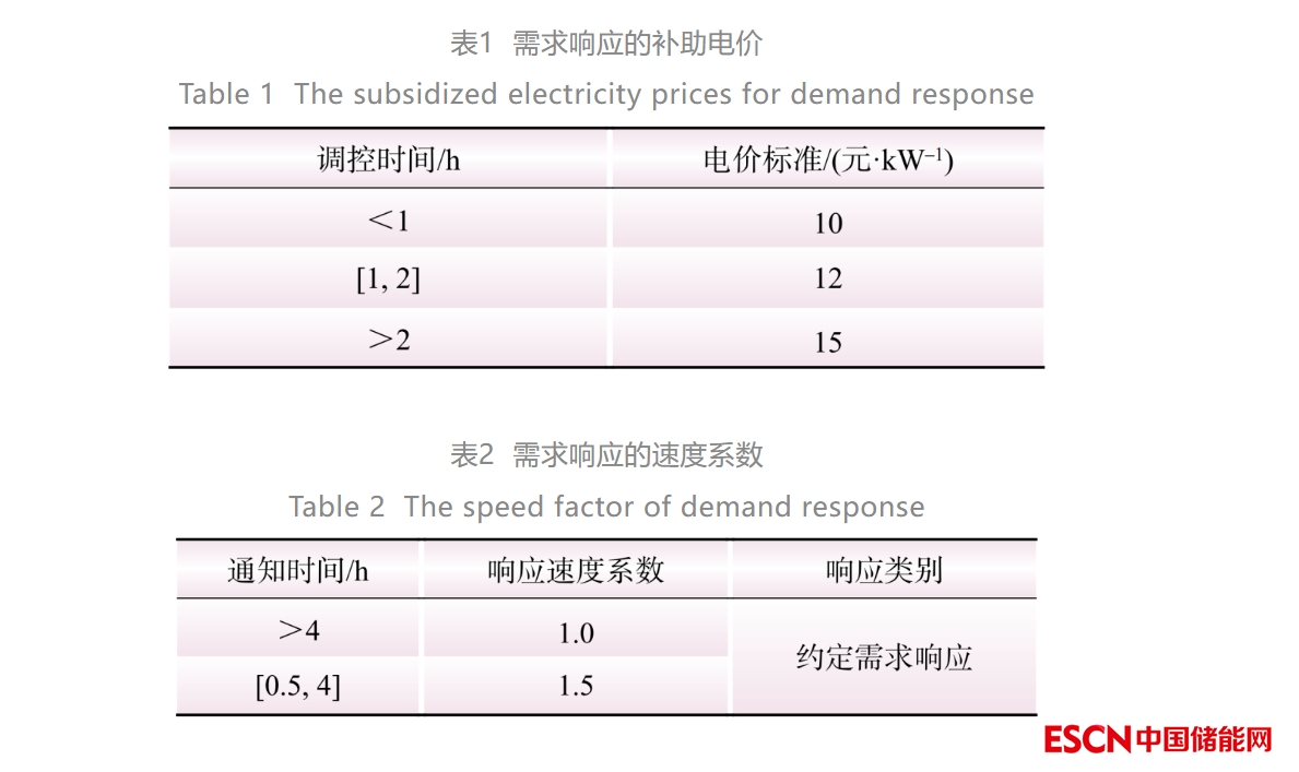 表1為參與響應的調控時間對應的補償電價標準。表2為根據(jù)需求響應提前通知用戶的時間,給出用戶獲得補償?shù)捻憫俣认禂?shù)。