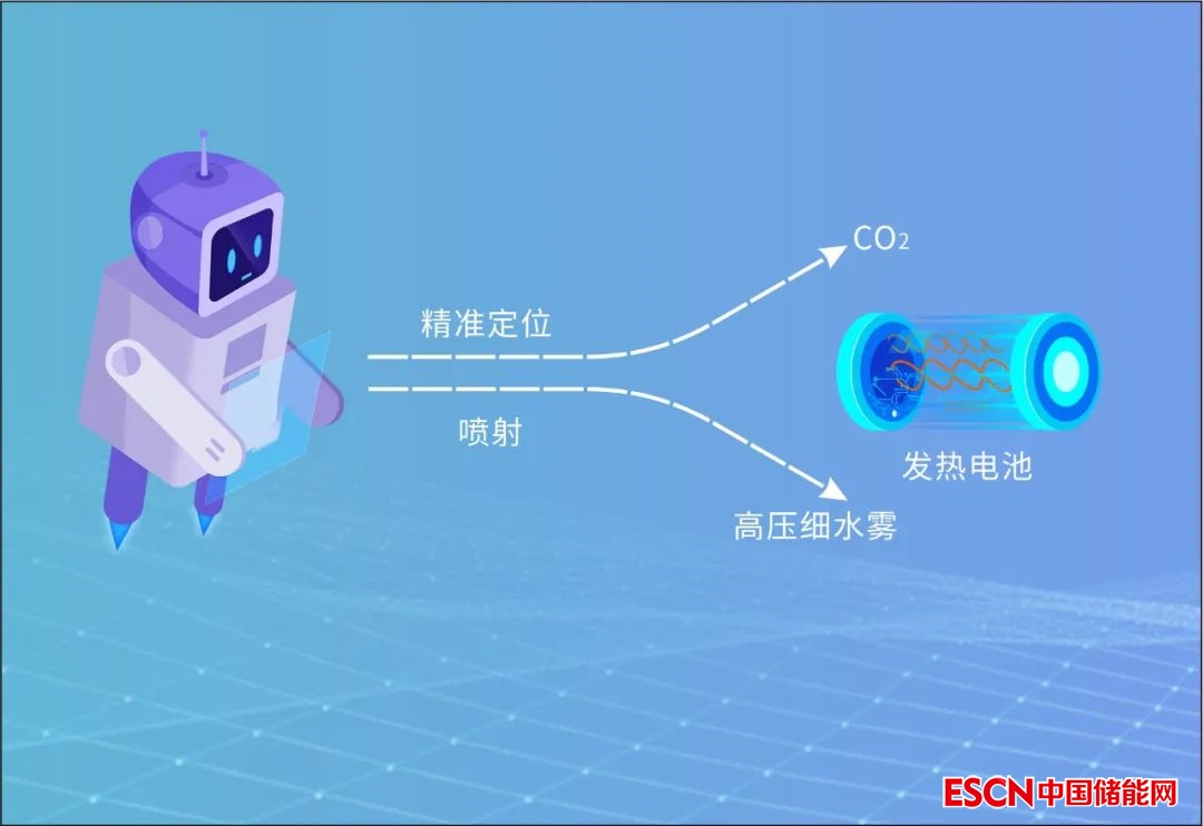當(dāng)單體電池發(fā)生熱失控時,可聯(lián)動電池管理系統(tǒng)(BMS)即“第一道安全閥”會把存在異常的電池位置信號反饋給消防機(jī)器人,消防機(jī)器人通過內(nèi)部計算,精準(zhǔn)定位找到異常電池所在的位置,對其持續(xù)噴淋高壓細(xì)水霧或二氧化碳半小時以上,進(jìn)行物理降溫吸能處理,為電池降溫提供雙重保障。