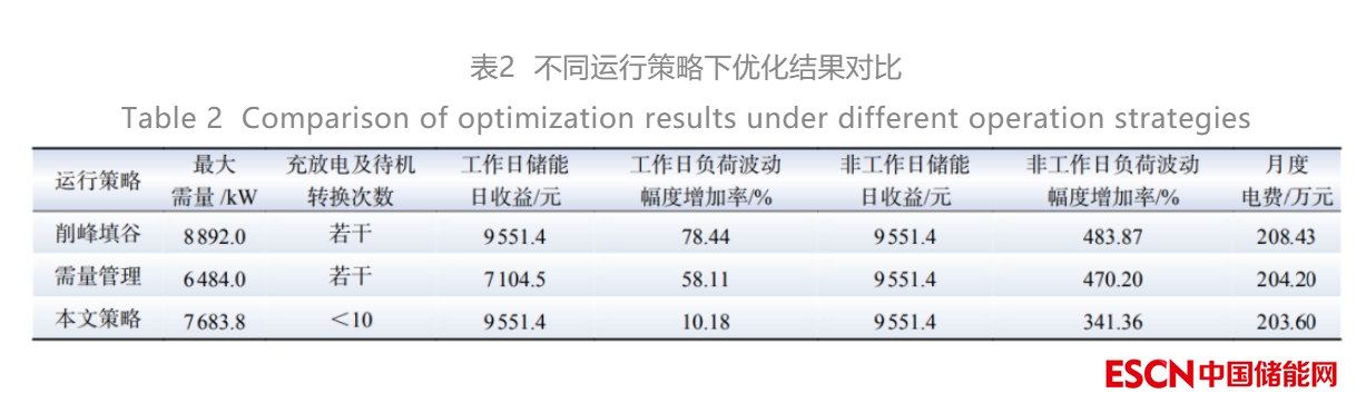表2對比了不同運(yùn)行策略下的優(yōu)化結(jié)果,最大需量方面,本文優(yōu)化策略的最大需量介于一般削峰填谷運(yùn)行策略和需量管理運(yùn)行策略之間;SOC過程控制方面,本文優(yōu)化策略的充放電及待機(jī)狀態(tài)轉(zhuǎn)換次數(shù)大幅減少;儲(chǔ)能收益方面,本文優(yōu)化策略的儲(chǔ)能工作日收益和削峰填谷運(yùn)行策略一樣達(dá)到最大收益,比一般需量管理運(yùn)行策略收益要大,幾種不同運(yùn)行策略的非工作日儲(chǔ)能收益相同;在負(fù)荷波動(dòng)幅度增加率方面,本文優(yōu)化策略的負(fù)荷波動(dòng)幅度增加率最小,并且相比削峰填谷運(yùn)行策略和需量管理運(yùn)行策略,非工作日比工作日的負(fù)荷波動(dòng)幅度增加率降低的更多,效果更顯著;在用戶最關(guān)心的月度用電成本上,本文優(yōu)化策略的月度電費(fèi)最小。