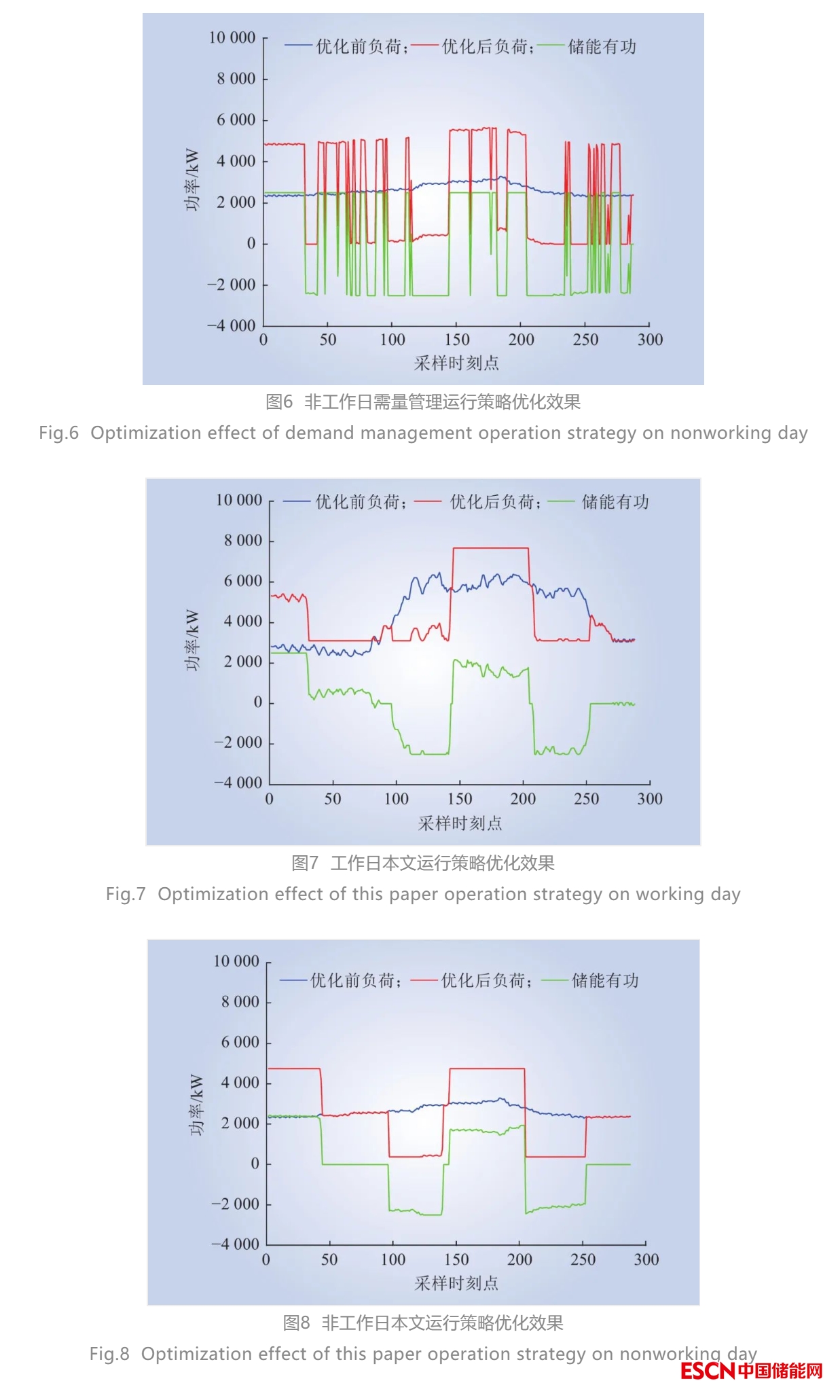 對一般削峰填谷運(yùn)行策略、需量管理運(yùn)行策略和本文提出的區(qū)分工作日和非工作日負(fù)荷的用戶側(cè)儲(chǔ)能多目標(biāo)優(yōu)化策略進(jìn)行Matlab仿真,功率曲線輸出結(jié)果如圖3~8所示。