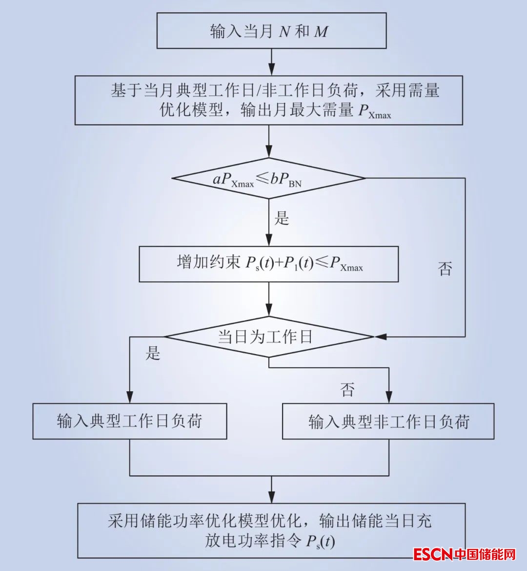 區(qū)分工作/非工作日負(fù)荷的用戶側(cè)儲(chǔ)能多目標(biāo)優(yōu)化策略主要由需量優(yōu)化模型和儲(chǔ)能功率優(yōu)化模型構(gòu)成,通過需量優(yōu)化模型計(jì)算出月最大需量 PXmax ,再用儲(chǔ)能功率優(yōu)化模型求得儲(chǔ)能充放電功率,主要流程如圖1所示。其中,b 為用戶變壓器容量單價(jià),元/(kW·月);PBN 為用戶變壓器容量。