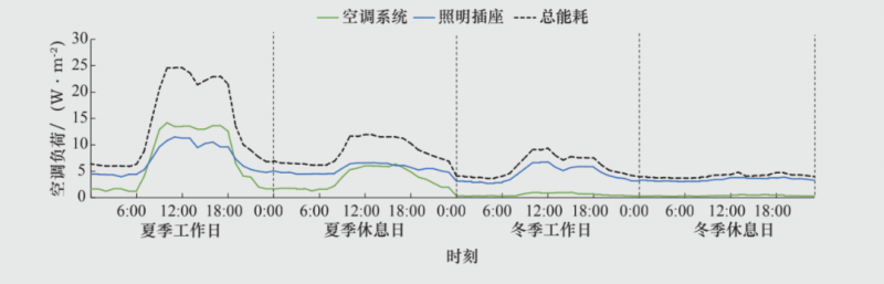 再選取典型日負(fù)荷曲線看,照明插座、動(dòng)力用電和特殊用電受季節(jié)的影響較小,而空調(diào)用電負(fù)荷則有明顯的季節(jié)差異性。以政府辦公建筑類型為例(其典型日負(fù)荷曲線見圖1),其夏季空調(diào)用電量占比高達(dá)40%,而冬季不到10%。如果能夠充分挖掘空調(diào)系統(tǒng)的靈活性,一方面配置蓄冷、蓄冰、蓄電等儲(chǔ)能設(shè)施,另一方面結(jié)合建筑的用能需求和負(fù)荷特性優(yōu)化空調(diào)的運(yùn)行調(diào)度策略,則有可能大幅降低夏季空調(diào)的負(fù)荷峰值。
