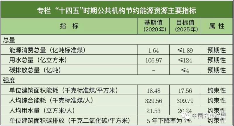(四)主要目標(biāo)。聚焦綠色低碳發(fā)展的目標(biāo),實現(xiàn)綠色低碳轉(zhuǎn)型行動推進有力,制度標(biāo)準(zhǔn)、目標(biāo)管理、能力提升體系趨于完善,協(xié)同推進、資金保障、監(jiān)督考核機制運行通暢,開創(chuàng)公共機構(gòu)節(jié)約能源資源綠色低碳發(fā)展新局面。實施公共機構(gòu)能源和水資源消費總量與強度雙控,公共機構(gòu)能源消費總量控制在1.89億噸標(biāo)準(zhǔn)煤以內(nèi),用水總量控制在124億立方米以內(nèi),二氧化碳排放(以下簡稱碳排放)總量控制在4億噸以內(nèi);以2020年能源、水資源消費以及碳排放為基數(shù),2025年公共機構(gòu)單位建筑面積能耗下降5%、人均綜合能耗下降6%,人均用水量下降6%,單位建筑面積碳排放下降7%。