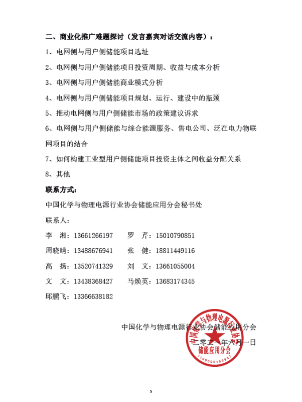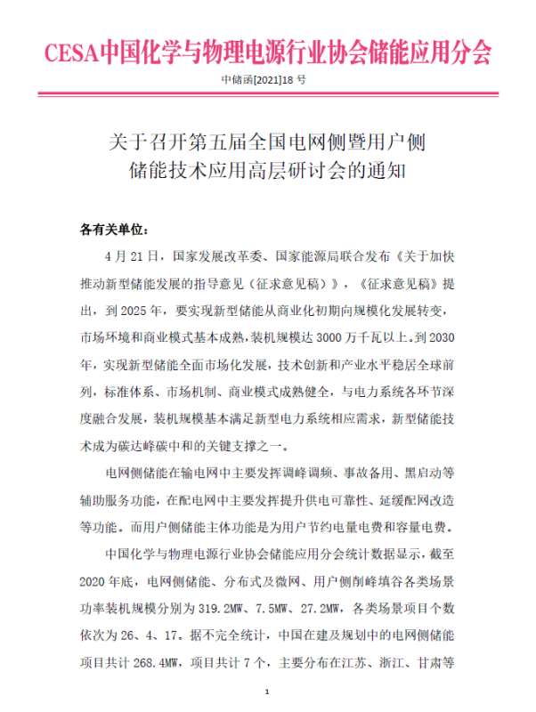 關(guān)于召開第五屆全國電網(wǎng)側(cè)暨用戶側(cè)儲能技術(shù)應(yīng)用高層研討會的通知