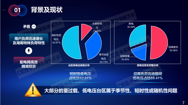 這是我們2020年對(duì)全省的配電變壓器過(guò)載現(xiàn)狀進(jìn)行的分析,我們發(fā)現(xiàn)有76%的配變過(guò)載集中在春節(jié)前后,而這些配變平均一年的重過(guò)載天數(shù)僅僅也只有7.75天,平均重過(guò)載時(shí)長(zhǎng)只有62.9個(gè)小時(shí)。因此,對(duì)于湖南來(lái)說(shuō),重過(guò)載與輕載并存的現(xiàn)象非常突出。此外,我們對(duì)低電壓臺(tái)區(qū)的情況也進(jìn)行了分析,發(fā)現(xiàn)短時(shí)性低電壓占比達(dá)52.81%,僅1月、2月和8月兩負(fù)荷高峰期間發(fā)生的低電壓占比就達(dá)到了69.41%。由此,我們可以得到結(jié)論,大部分的重過(guò)載低電壓臺(tái)區(qū)是屬于季節(jié)性、短時(shí)性或隨機(jī)性的問(wèn)題。