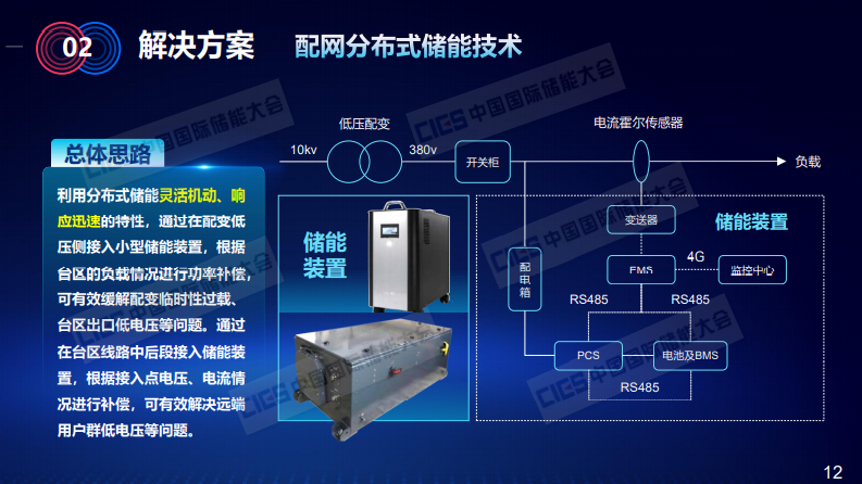 而儲(chǔ)能技術(shù)和物聯(lián)網(wǎng)技術(shù)的發(fā)展,為我們解決這兩個(gè)矛盾提出了一個(gè)新的思路,下面我們來(lái)介紹解決方案。第一,是我們剛才提到的配網(wǎng)側(cè)分布式儲(chǔ)能技術(shù)??傮w思路如下,它主要是利用分布式儲(chǔ)能靈活機(jī)動(dòng)、響應(yīng)迅速的特性,通過(guò)在配電臺(tái)區(qū)380V的主線并聯(lián)接入儲(chǔ)能裝置,通過(guò)實(shí)時(shí)監(jiān)控臺(tái)區(qū)以及用戶側(cè)的負(fù)荷、電流、電壓等相關(guān)的負(fù)荷數(shù)據(jù),在系統(tǒng)有需要的進(jìn)行實(shí)時(shí)就地的功率補(bǔ)充,以此解決相應(yīng)的重過(guò)載問(wèn)題。解決低電壓的問(wèn)題,一般來(lái)說(shuō)用戶低電壓是出現(xiàn)在臺(tái)區(qū)的末端,也就是380V主線后端位置,在這種情況下,我們會(huì)將儲(chǔ)能裝置并聯(lián)接入末端集中低電壓用戶群前面一點(diǎn)點(diǎn)的位置,通過(guò)監(jiān)測(cè)接入點(diǎn)的電壓、電流等相關(guān)數(shù)據(jù),進(jìn)行就地補(bǔ)充,以此減少主線上因?yàn)榇筘?fù)荷電流所產(chǎn)生的壓降,以此來(lái)解決負(fù)荷側(cè)的低電壓?jiǎn)栴},這點(diǎn)對(duì)于山區(qū)用戶是非常有效的。