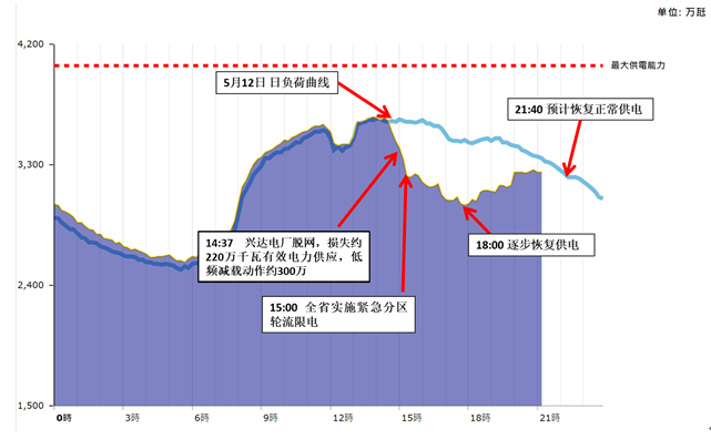 5月13日14時37分,興達電廠因接入345千伏路北變電站母線故障,導致電廠電力送出受阻,兩臺燃煤及兩臺燃氣機組脫網(wǎng),系統(tǒng)損失有效電力供應約220萬千瓦,造成臺灣系統(tǒng)頻率驟降,為維持電網(wǎng)穩(wěn)定,電力系統(tǒng)在第一時間自動啟動低頻卸載約300萬千瓦。臺電評估短時間內(nèi)無法立即復電,為維系電力系統(tǒng)安全,自下午3時起執(zhí)行緊急分區(qū)輪流停電,最大限電達到350萬千瓦。后據(jù)政府官員稱,計劃在晚21點40分恢復供電。事故過程系統(tǒng)負荷變化曲線下圖所示。