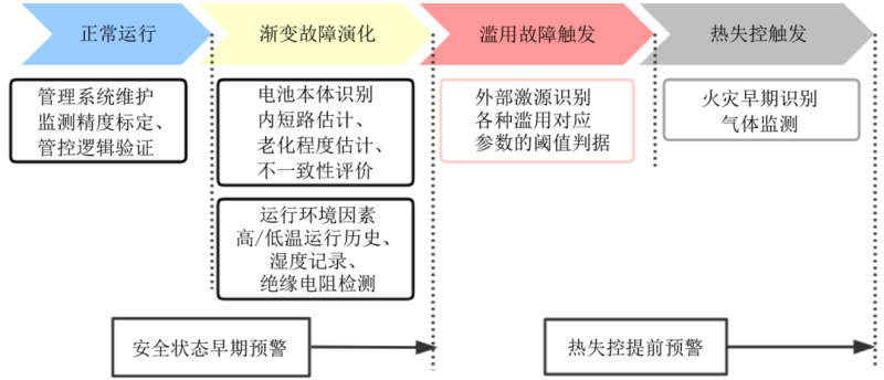 結(jié)合韓國儲能電站事故分析,電池本體因素及運行環(huán)境因素逐漸演化是引起儲能電站事故的根本誘因。鑒于該類因素的長周期演化特性,我們將鋰電池儲能系統(tǒng)安全性評估劃分為兩個層次。一是安全狀態(tài)早期預(yù)警,二是熱失控的提前預(yù)警,如圖4所示。