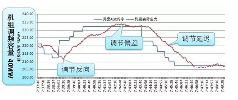 火電機(jī)組需要磨煤、燃燒的過程,能量轉(zhuǎn)換時(shí)間較長,存在調(diào)節(jié)速率慢、折返延遲和誤差大的缺點(diǎn)。具體表現(xiàn)為調(diào)節(jié)的延遲、偏差(超調(diào)和欠調(diào))等現(xiàn)象,如圖: