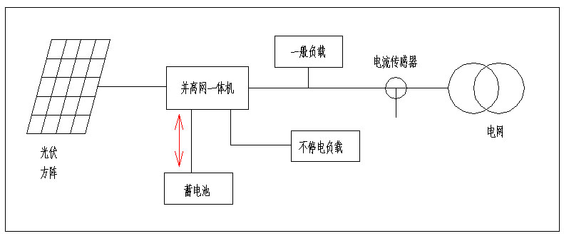 并離網(wǎng)型光伏發(fā)電系統(tǒng),安裝在用戶側(cè),系統(tǒng)由太陽(yáng)電池組件組成的光伏方陣、太陽(yáng)能并離網(wǎng)一體機(jī)、蓄電池組、負(fù)載等構(gòu)成。與離網(wǎng)系統(tǒng)對(duì)比,并離網(wǎng)逆變器交流輸出有兩個(gè)接口,其中一個(gè)接口連接電網(wǎng),系統(tǒng)既可以向電網(wǎng)送電,也可以從電網(wǎng)取電給蓄電池充電,另外一個(gè)接口連接重要負(fù)載,它既可以由電網(wǎng)供電,如果電網(wǎng)停電,它也可以由光伏和儲(chǔ)能電池供電。