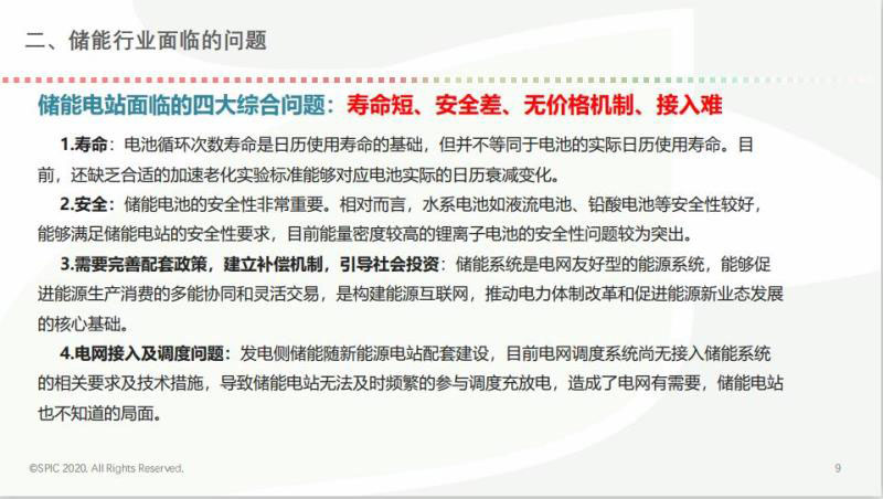 首先,一個(gè)方面還是儲(chǔ)能技術(shù)本身的一些問(wèn)題,我們認(rèn)為現(xiàn)在儲(chǔ)能技術(shù)一個(gè)是壽命,因?yàn)橹饕闹髁骷夹g(shù)路線還是鋰電池,但是它的壽命,各位經(jīng)常講循環(huán)次數(shù),包括我也知道有很多廠家說(shuō)循環(huán)次數(shù)已經(jīng)到了8000次甚至1萬(wàn)次。但是我們這里更關(guān)注一個(gè)實(shí)際日歷使用壽命,我們認(rèn)為大家說(shuō)的循環(huán)次數(shù)跟實(shí)際的日歷使用壽命不是一個(gè)概念。但實(shí)際上這都是沒有經(jīng)過(guò)特別多的試驗(yàn)和驗(yàn)證和技術(shù)仿真,尤其是在實(shí)際日歷壽命這一塊需要做加速老化試驗(yàn)或者仿真計(jì)算的,我們覺得這一塊是需要業(yè)內(nèi)關(guān)注的。