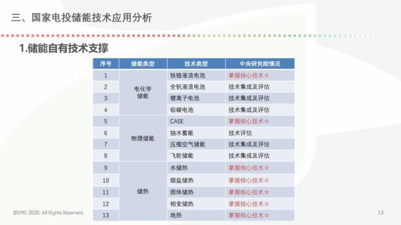 這個(gè)是國(guó)家電投集團(tuán)現(xiàn)在自有技術(shù)的分布情況,其實(shí)我剛才也說(shuō)了,我們這邊不只關(guān)注電儲(chǔ)能,我們也比較關(guān)注熱儲(chǔ)能。在現(xiàn)在電化學(xué)儲(chǔ)能、物理儲(chǔ)能和熱儲(chǔ)能里頭,我們有一部分的技術(shù)是掌握核心的,有一部分是我們做技術(shù)評(píng)估的。