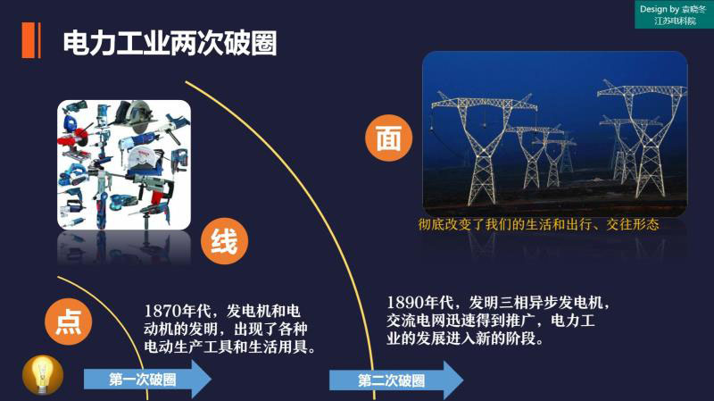 第二次破圈大概發(fā)生在1890年的時候,主要是發(fā)明了三相異步發(fā)電機,電力工業(yè)的發(fā)展就到了一個新的階段,有沒有想過電力發(fā)展是這樣過來的?其實不是因為有了電,馬上就有了電網(wǎng),中間是兩次破圈之后有了電網(wǎng),而有了電網(wǎng)之后徹底改變我們的生活和出行,包括我們所有交往的形態(tài)。后面有了飛機,現(xiàn)在有了高鐵,如果沒有強大的電網(wǎng)在后面撐著,我們的高鐵其實是不可能跑起來的。高鐵都是接入220千伏的電網(wǎng),這么大的沖擊容量,如果沒有后端的強大電網(wǎng)支撐,它是跑不起來的。所以前端必須是先被破圈之后,可能才有高鐵,所以在這個之前,大家再大的想象力可能也想不出高鐵這個東西。這就是行業(yè)在破圈之后,應(yīng)用范圍會做巨大的漣漪式擴散。
