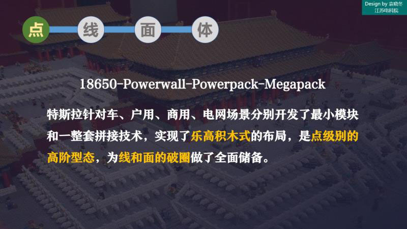 在點這件事上,我認為特斯拉其實是做到了極致,從18650到Powerwall億到Powerpack到Megapack,就實現(xiàn)了一個樂高積木式的布局,是一個點級別最高的形態(tài),也是為后面的破圈做了全面的儲備。
