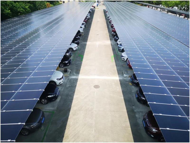 ▲ 位于閔行工業(yè)區(qū)上海電機(jī)廠內(nèi)的薄膜光伏車棚