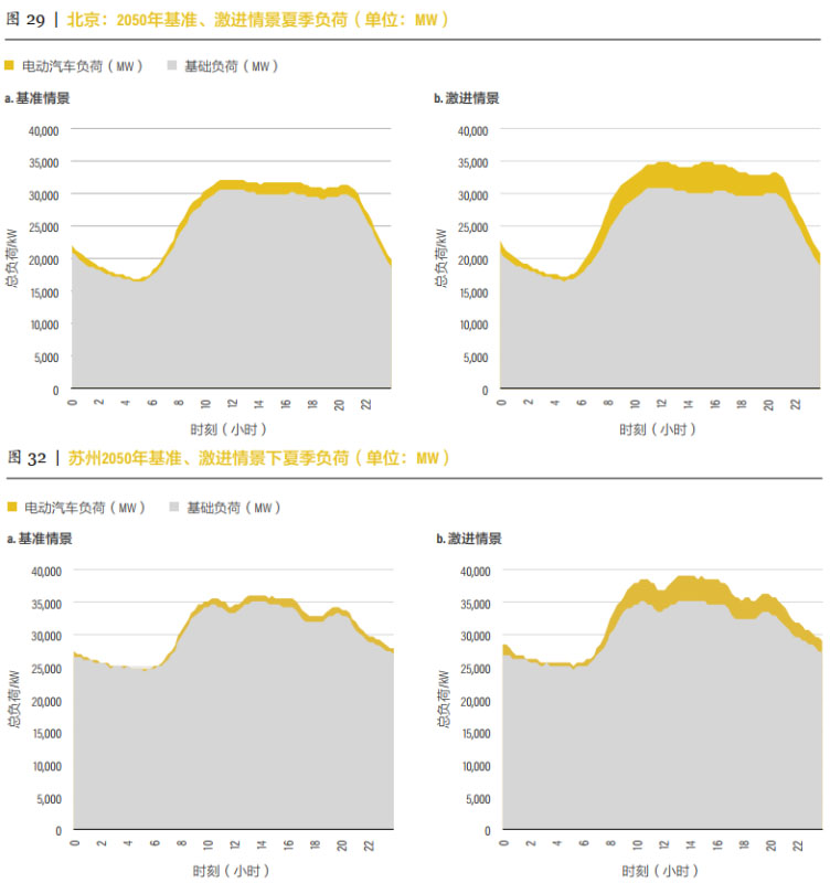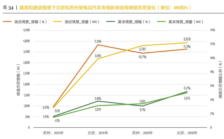 從用電量來(lái)看,北京2050年激進(jìn)情景下,電動(dòng)汽車日用電量約占北京全社會(huì)用電量的10.9%;基準(zhǔn)情景下占比約為5.0%;蘇州2050年激進(jìn)情景下,電動(dòng)汽車用電量將占全社會(huì)用電量的8.6%,基準(zhǔn)情景下的電動(dòng)汽車用電量則占3.0%。
