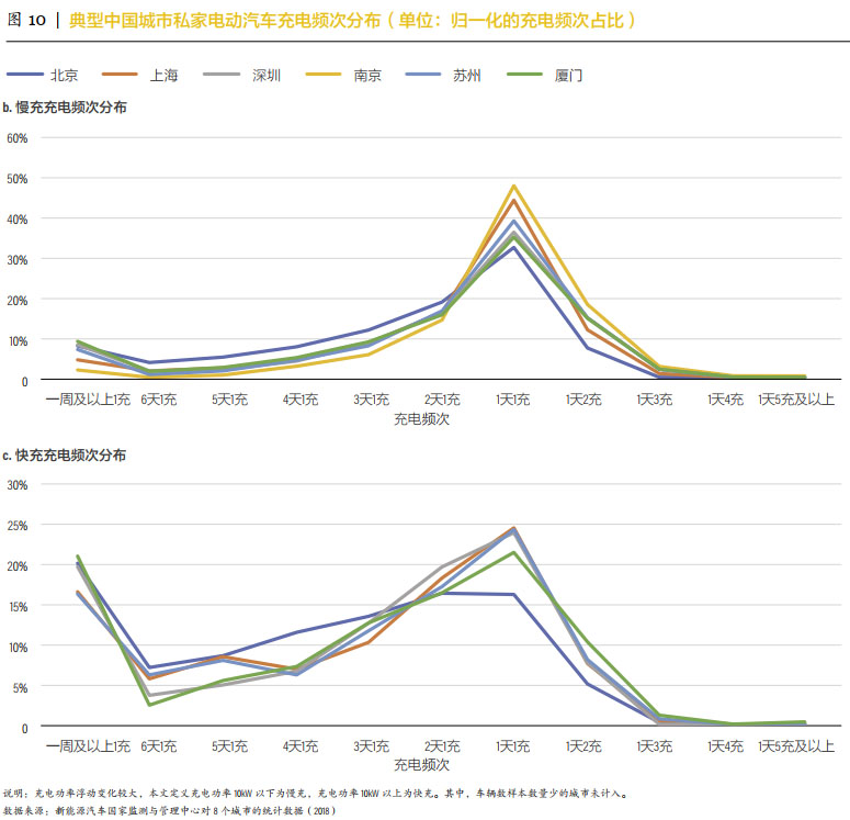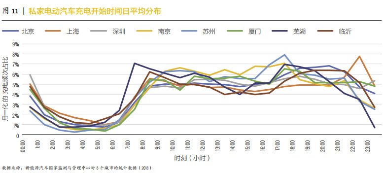在報(bào)告選擇的八個(gè)城市中,私家電動(dòng)汽車的起始充電時(shí)間規(guī)律大致上相同,但是受到不同城市工作時(shí)間、峰谷電價(jià)差、充電樁配套完善程度等因素的影響,起始充電時(shí)間在細(xì)節(jié)上有所差異:蕪湖的起始充電時(shí)間集中在早晨7點(diǎn)到9點(diǎn)之間,表明居民是在達(dá)到辦公地點(diǎn)后開始充電;而蘇州、南京、廈門和臨沂的起始充電時(shí)間在集中在下午17點(diǎn)到晚上20點(diǎn),是下班后開始充電;而北京、上海、深圳等則是集中在晚上20點(diǎn)之后,尤其深圳的高峰期在晚上23-24點(diǎn)。