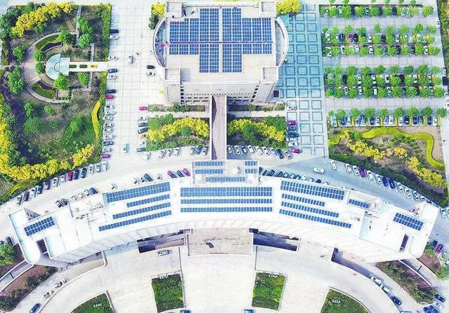 辦公樓頂由425塊太陽能電池板組成的光伏項目,裝機容量300千瓦。