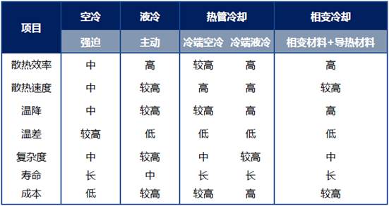 這幾種技術的核心區(qū)別在于散熱速率和成本。風冷的結構簡單,成本低,但散熱速率最低;液冷散熱速率高于風冷,但結構更復雜,成本更高于風冷。熱管冷卻和相變材料冷卻仍在實驗室階段,散熱速率更高,但成本也更高。
