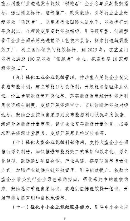 計(jì)劃提出的主要目標(biāo)是:到2025年,重點(diǎn)工業(yè)行業(yè)能效全面提升,數(shù)據(jù)中心等重點(diǎn)領(lǐng)域能效明顯提升,綠色低碳能源利用比例顯著提高,節(jié)能提效工藝技術(shù)裝備廣泛應(yīng)用,標(biāo)準(zhǔn)、服務(wù)和監(jiān)管體系逐步完善,鋼鐵、石化化工、有色金屬、建材等行業(yè)重點(diǎn)產(chǎn)品能效達(dá)到國際先進(jìn)水平,規(guī)模以上工業(yè)單位增加值能耗比2020年下降13.5%。能盡其用、效率至上成為市場主體和公眾的共同理念和普遍要求,節(jié)能提效進(jìn)一步成為綠色低碳的“第一能源”和降耗減碳的首要舉措。