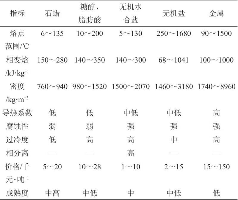 按照工作溫度,固-液相變材料又分低溫相變材料和高溫相變材料。其中,低溫相變材料主要包括聚乙二醇、石蠟和脂肪酸等有機物及無機水合鹽,中高溫相變材料主要包括無機鹽、金屬和合金等。不同的相變材料特點見表2。從表中可以看出,石蠟、無機水合物等低溫相變材料技術成熟度相對較高,已實現(xiàn)部分材料的示范應用,但是仍存在導熱系數(shù)低、腐蝕性、過冷度和相分離等問題;無機鹽、金屬等中高溫相變材料雖然具有相變焓較大、密度較高等優(yōu)點,但是相關材料腐蝕性、過冷度等問題仍需要進一步研究,目前技術成熟度較低,仍處于實驗室研究階段。