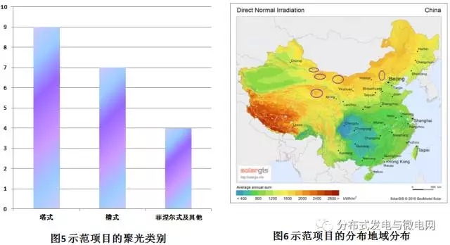 “十二五”發(fā)展落實情況:截至2015年底,全國已建成實驗示范性太陽能熱發(fā)電站(系統(tǒng))6座,裝機規(guī)模為1.388萬千瓦;2016年9月,國家能源局印發(fā)《關于建設太陽能熱發(fā)電示范項目的通知》(國能新能[2016]223號),確定第一批20個太陽能熱發(fā)電示范項目,其中包括9個塔式電站,7個槽式電站和4個菲涅爾電站,總計裝機容量134.9萬千瓦,分布見圖5。項目主要分布在青海省、甘肅省、河北省、內蒙古自治區(qū)、新疆自治區(qū)五個省區(qū),其中以甘肅項目數(shù)最多,分布見圖6。