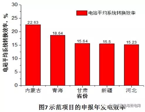 圖6和圖7顯示了示范項目的地點、太陽能DNI和效率情況。示范項目全部分布在我國北方地區(qū)。除了張家口市外,在甘肅,青海,內蒙古和新疆等西北地區(qū)。從圖6可見,建站地點的年DNI值基本在2000kWh/m2左右,沒有超過2200kWh/m2的。圖7可見示范項目的效率分布在15-22%之間。