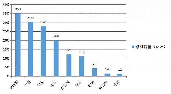 根據(jù)國際能源署太陽能熱發(fā)電和熱化學組織(SolarPACES)統(tǒng)計,截至2016年2月底,全球在建太陽能光熱發(fā)電站裝機容量約1.4GW。其中摩洛哥在建裝機容量最高,達350MW,包括裝機200MW的NOORII槽式光熱電站和裝機150MW的NOORIII塔式光熱電站。中國近幾年也開始發(fā)展光熱發(fā)電產(chǎn)業(yè),在建裝機容量位居第二位,為300MW(與國內(nèi)統(tǒng)計數(shù)據(jù)略有出入)。印度在建項目的裝機容量達278MW,位居第三位,其后是南非、以色列、智利等國。