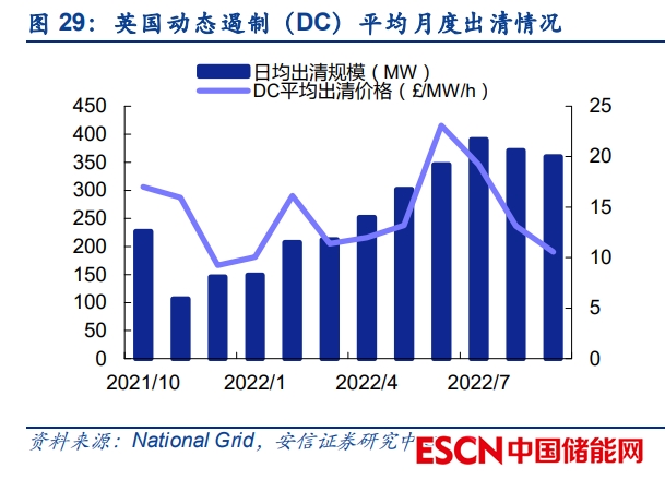 近年來海外發(fā)達(dá)地區(qū)電力輔助服務(wù)市場(chǎng)整體呈擴(kuò)大趨勢(shì),但市場(chǎng)容量或相對(duì)有限。在英國(guó)等 地區(qū)近年來調(diào)頻輔助服務(wù)是儲(chǔ)能項(xiàng)目主要的收益來源,且收益相當(dāng)可觀,例如當(dāng)前英國(guó) DC 輔助服務(wù)的出清價(jià)格在 10 英鎊/MW/h 以上,對(duì)應(yīng)每 kW 的年化收入超過 80 英鎊。但整體上 看,調(diào)頻輔助服務(wù)的市場(chǎng)容量相對(duì)有限(例如英國(guó) DC、FFR 輔助服務(wù)市場(chǎng)總規(guī)模僅為數(shù)百 MW),隨著越來越多的電化學(xué)儲(chǔ)能項(xiàng)目進(jìn)入市場(chǎng),輔助服務(wù)市場(chǎng)的價(jià)格或?qū)⒚媾R一定壓力, 近年來德國(guó)、美國(guó) PJM、美國(guó) CAISO 等電力市場(chǎng)均經(jīng)歷了“輔助服務(wù)價(jià)格高企-大量?jī)?chǔ)能項(xiàng) 目進(jìn)入市場(chǎng)-輔助服務(wù)價(jià)格下降-儲(chǔ)能項(xiàng)目收益下降”的發(fā)展過程。