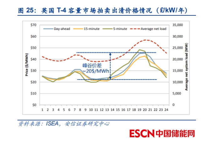 容量電價(jià)是海外大型儲(chǔ)能項(xiàng)目最具確定性的收益來源,近年來出清價(jià)格持續(xù)上行。在英國(guó)、 美國(guó)加州等地區(qū),儲(chǔ)能項(xiàng)目可與大型電網(wǎng)企業(yè)簽訂長(zhǎng)期容量電價(jià)合約,按照自身能夠提供的容量(通常需根據(jù)儲(chǔ)能時(shí)長(zhǎng)折算)獲取月度或年度固定補(bǔ)償,在海外儲(chǔ)能項(xiàng)目的收益來源中, 容量電價(jià)具有較高的確定性。隨著傳統(tǒng)火電機(jī)組的逐步退役以及電價(jià)中樞的上漲,近年來海 外地區(qū)容量電價(jià)整體呈上行趨勢(shì),例如英國(guó) 2022 年 2 月舉辦的 T-4 容量市場(chǎng)拍賣出清價(jià)格 創(chuàng)下 30.59 英鎊/kW/年的歷史新高,有近 3.3GW 的電池儲(chǔ)能項(xiàng)目中標(biāo)(降額折算后約為 1.09GW);2022 年加州 Resource Adequacy 平均成交價(jià)格亦超過 6 美元 kW/月,較 2017-2018 年的低點(diǎn)提升超過一倍。