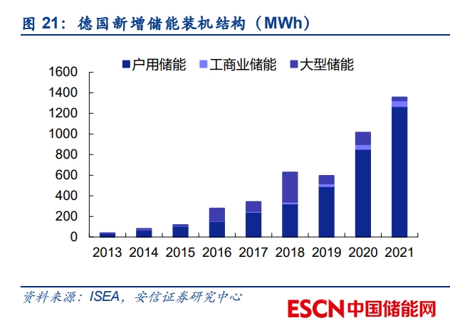 歐洲電價(jià)大幅上行刺激戶用儲(chǔ)能需求爆發(fā),貢獻(xiàn) 2022 年海外儲(chǔ)能裝機(jī)的主要增量。與國(guó)內(nèi) 情況不同,絕大多數(shù)海外地區(qū)的居民電價(jià)水平明顯高于工商業(yè)電價(jià),因此海外用戶側(cè)儲(chǔ)能主 要集中在居民家庭端,近年來戶用儲(chǔ)能在海外整體儲(chǔ)能裝機(jī)中的占比達(dá)到 30%左右。2022 年俄烏沖突等因素導(dǎo)致歐洲天然氣及電力價(jià)格大幅飆升,戶用儲(chǔ)能的經(jīng)濟(jì)性與居民接受度隨 之明顯提升,2022 年戶用儲(chǔ)能市場(chǎng)成為拉動(dòng)海外儲(chǔ)能裝機(jī)增長(zhǎng)的主要因素。
