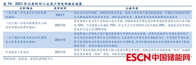 國(guó)內(nèi)工業(yè)用戶存在配臵儲(chǔ)能的潛在需求,保障供電穩(wěn)定性及降低綜合用電成本是主要驅(qū)動(dòng)因 素。受能耗雙控、極端天氣等多種因素影響,2021 年以來國(guó)內(nèi)多地限電現(xiàn)象頻發(fā),嚴(yán)重影 響高耗能企業(yè)的正常生產(chǎn),與此同時(shí)工業(yè)用戶的用電成本亦明顯上升。2021 年以來國(guó)家層 面密集發(fā)布各類政策,整體的思路是推動(dòng)工商業(yè)用戶全部進(jìn)入電力市場(chǎng)、高耗能企業(yè)市場(chǎng)交 易電價(jià)不受上浮比例限制、拉大峰谷價(jià)差、新增可再生能源不計(jì)入能耗指標(biāo)等,因此我們認(rèn) 為當(dāng)前國(guó)內(nèi)工商業(yè)用戶配臵儲(chǔ)能的需求已較為迫切。
