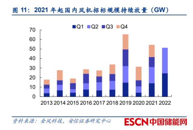2022 下半年起國(guó)內(nèi)大型風(fēng)光項(xiàng)目建設(shè)進(jìn)度有望明顯加快,配套儲(chǔ)能項(xiàng)目加速落地。2022 年 上半年受疫情、硅料緊缺、裝機(jī)成本高企等多方面影響,大型風(fēng)光項(xiàng)目建設(shè)進(jìn)度相對(duì)較慢, 上半年國(guó)內(nèi)新增風(fēng)電、地面光伏裝機(jī)僅為 12.9GW/11.2GW,與此前預(yù)期存在一定差距???慮到 2021 年以來國(guó)內(nèi)風(fēng)機(jī)招標(biāo)持續(xù)放量,而光伏硅料的產(chǎn)出亦從四季度起實(shí)質(zhì)性放量(七 八月份受檢修、限電、疫情等因素并未充分釋放),我們對(duì) 2022 年下半年以及 2023 年國(guó)內(nèi) 大型風(fēng)光項(xiàng)目裝機(jī)持積極態(tài)度,相應(yīng)的配套儲(chǔ)能亦有望加速落地。