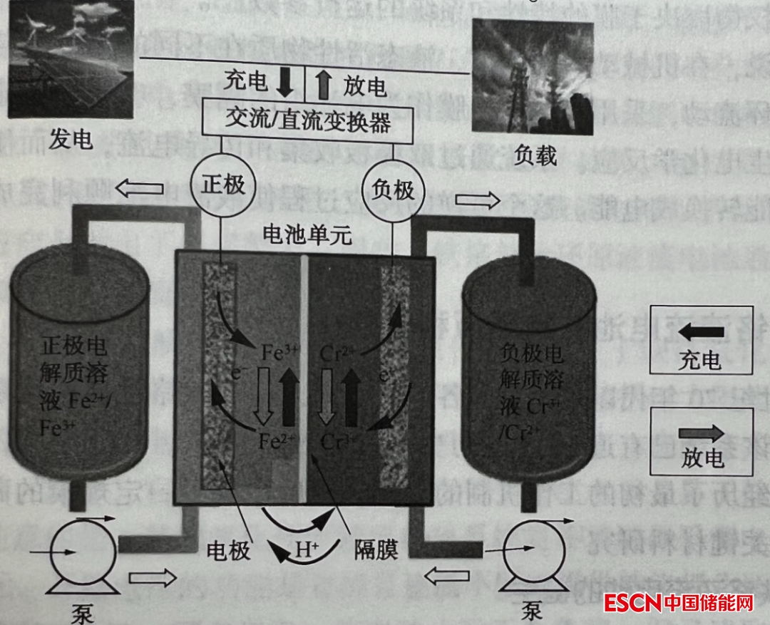 充放電過程中,電解液通過循環(huán)泵進(jìn)入兩個半電池中,F(xiàn)e3+/Fe2+電對和Cr3+/Cr2+電對分別在電極表面進(jìn)行氧化還原反應(yīng),正極釋放電子通過外電路傳遞到負(fù)極,電池內(nèi)部通過離子在溶液內(nèi)移動,并與離子交換膜進(jìn)行質(zhì)子交換,形成完整回路。