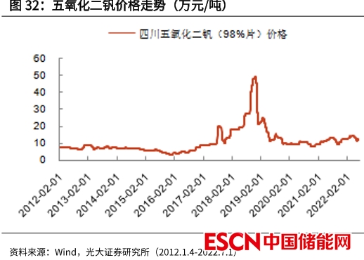上文說到全釩的痛點在于初裝成本,目前釩電池成本中,電堆占35%,電解液占40%,其他器件如膜、控制器等占25%。電解液是成本大頭,而電解液成本又主要由釩構(gòu)成,所以釩的價格是影響電池成本的最大因素。未來釩電池價格能否下降,取決于釩價能否下降。