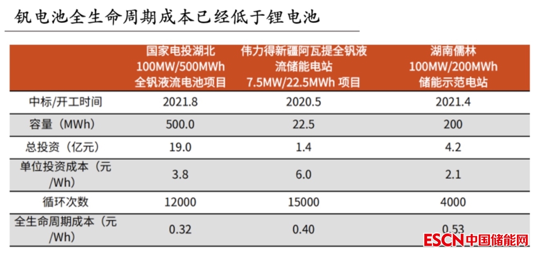 但是從全生命周期角度看,全釩的成本約0.32-0.4元/Wh,成本依然低于鋰電池(鋰電池成本0.5-0.7元/Wh)。