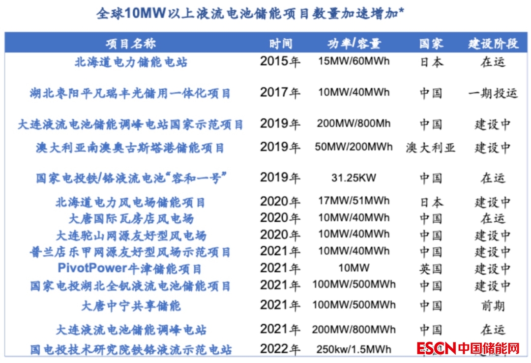 可以看到,2020年之后10MW以上的液流電池儲能項目出現(xiàn)井噴式增長。尤其是國家能源局批準(zhǔn)建設(shè)的首個國家級大型化學(xué)儲能示范項目——大連液流電池儲能調(diào)峰電站(全釩) 的建設(shè)規(guī)模達(dá)到了200MW,總投資38億元。第一期工程已建設(shè)完成,于今年5月正式接入遼寧電網(wǎng),正式進(jìn)入商業(yè)化運行階段。