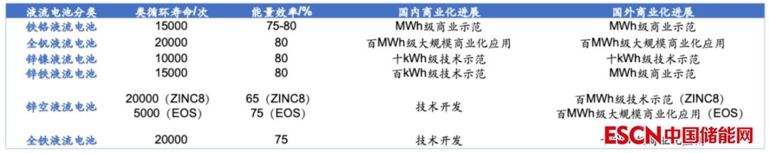 根據(jù)電極活性物質(zhì)的不同,可分為全釩液流電池、鐵鉻液流電池、鋅溴液流電池、鉛酸液流電池等。其中全釩液流電池商業(yè)化進(jìn)展最快,鐵鉻、鋅溴還在商業(yè)化初期。