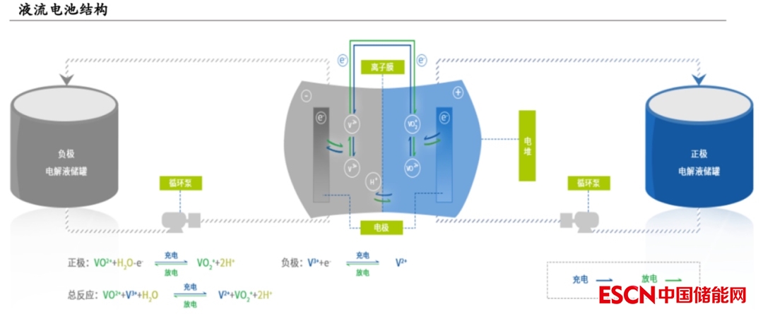 原理是通過正負(fù)極電解液中的活性物質(zhì)發(fā)生氧化還原反應(yīng)(電解液之間循環(huán))來儲存和釋放電能。