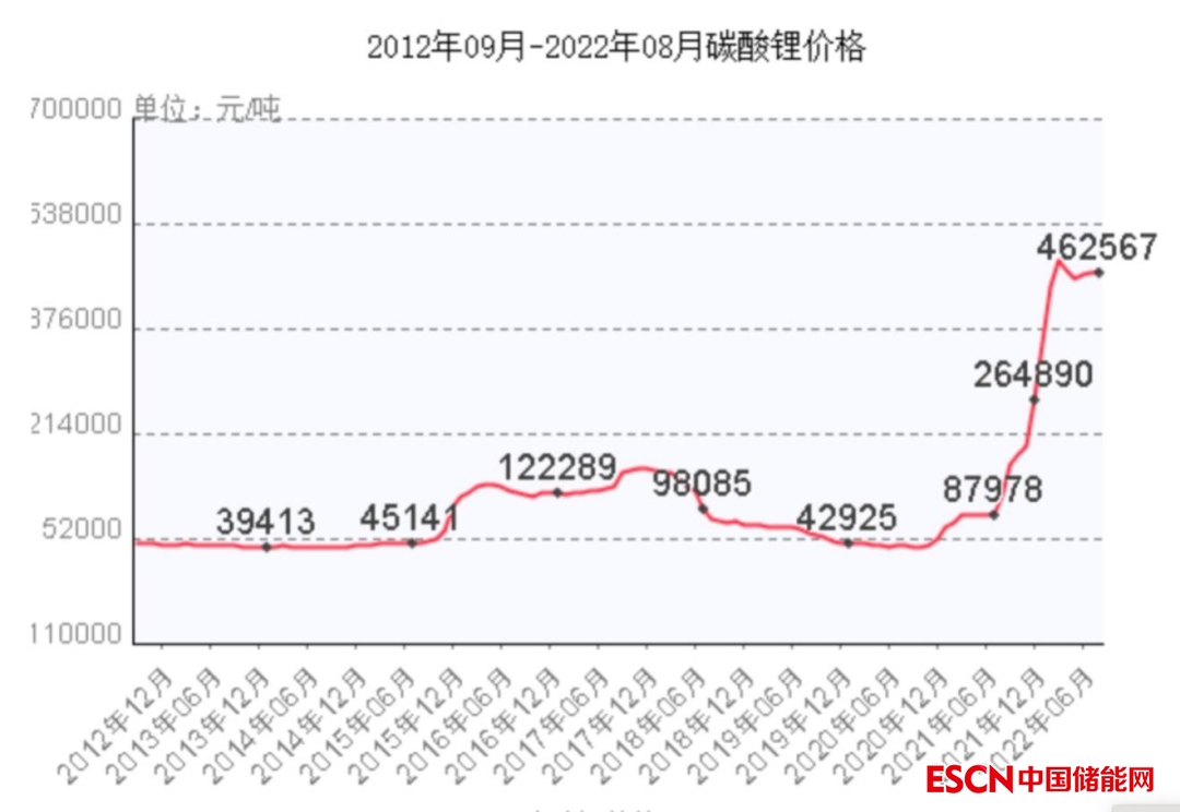 磷酸鐵鋰電池不光在儲能中是主流路線,在新能源車中也是。在近幾年新能源車和儲能的強勢合攻下,上游碳酸鋰價格已經(jīng)從2020年的4.3萬元/噸上漲到了如今的46萬元/噸,并維持在高位。