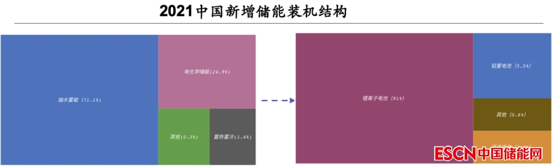 目前,短時儲能的鋰離子電池和長時儲能的抽水蓄能方案在市場中的主導(dǎo)地位非常明顯。根據(jù)《2022儲能產(chǎn)業(yè)應(yīng)用研究報告》的數(shù)據(jù),在2021年中國新增儲能裝機結(jié)構(gòu)中,抽水蓄能占據(jù)71%的份額,而在新裝機的電化學(xué)儲能中,鋰離子電池占據(jù)了91%的份額。