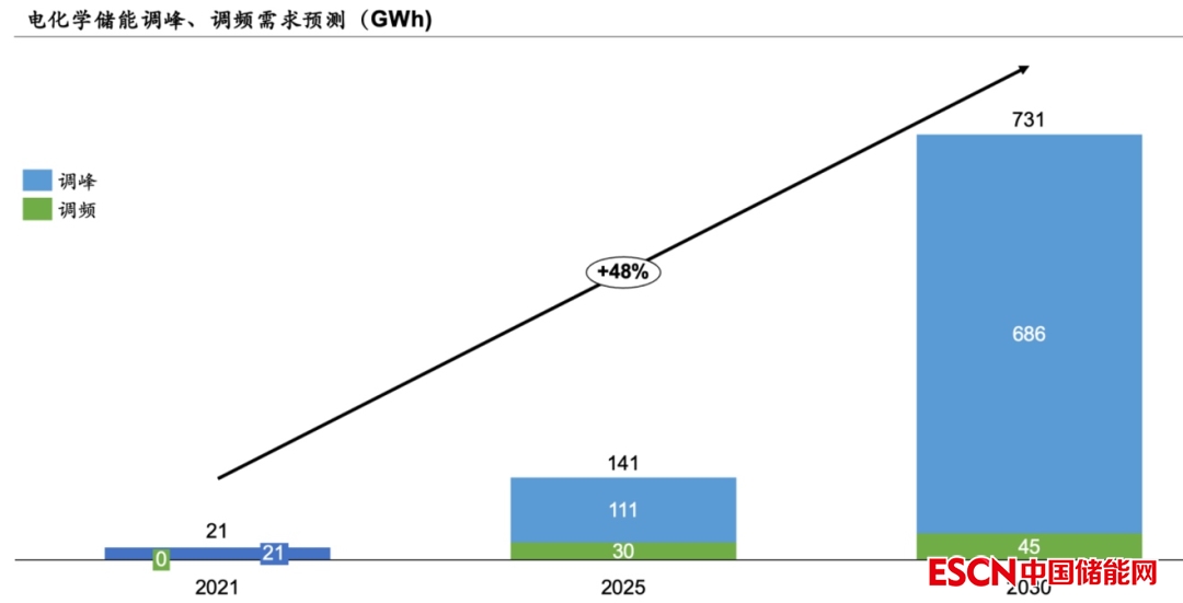 到2025年和2030年,我國電化學(xué)儲能的調(diào)峰、調(diào)頻缺口將分別達(dá)到141GWh和731GWh,相比于2021年數(shù)據(jù),CAGR可達(dá)48%。