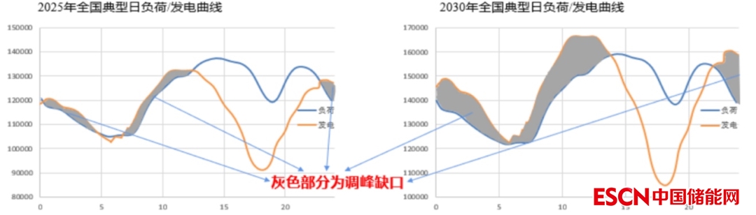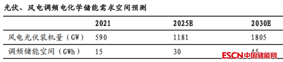 目前火電機組調(diào)頻容量配比為額定功率的2.5%,新能源發(fā)電配比為5%。由此計算得到2025年和2030年的調(diào)頻儲能空間約30GWh和45GWh。