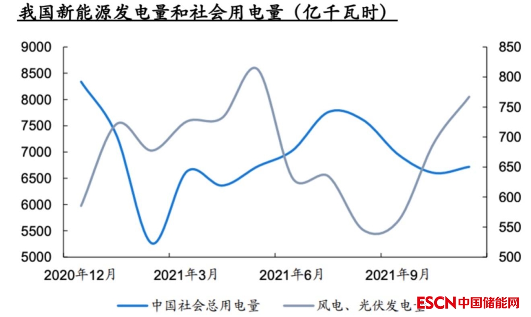 全社會用電量7-9月和12月是高峰,2-4及11月是低谷。而風(fēng)電和光伏發(fā)電量3-5月及11月是高峰,兩者峰谷錯位。