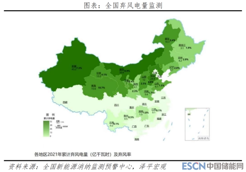 但與此同時(shí),棄風(fēng)和棄光電量的絕對(duì)量增長(zhǎng)顯著。2021年,全國(guó)棄風(fēng)電量206.1億千瓦時(shí),棄光電量67.8億千瓦時(shí)。棄電總量約為267.48億千瓦時(shí),同比高增約22.7%。西藏、青海等省份棄光率較高,光伏利用率僅為86.2%、80.2%。未來(lái),隨著電力供給結(jié)構(gòu)向風(fēng)光傾斜,新能源發(fā)電量大幅上漲,棄風(fēng)和棄光電量將在未來(lái)一段時(shí)間保持上升趨勢(shì),新能源發(fā)電消納上網(wǎng)問(wèn)題仍不容小覷,需要積極運(yùn)用儲(chǔ)能系統(tǒng)解決棄電問(wèn)題。