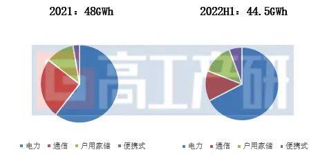 根據(jù)GGII半年度調(diào)研統(tǒng)計,2022年H1儲能鋰電池出貨量達到44.5GWh,整體規(guī)模已接近2021年全年水平。其中電力儲能占比超60%,戶用家儲和便攜式儲能表現(xiàn)超乎預期,通信儲能出貨節(jié)奏相對平緩。