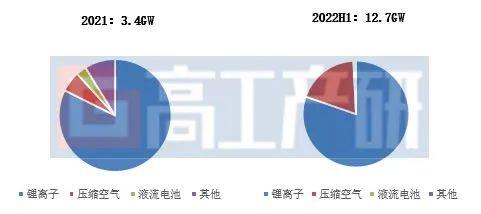 從具體技術(shù)路線看,鋰離子電池憑借完善的產(chǎn)業(yè)配套、循環(huán)壽命長、建設工期短、轉(zhuǎn)化效率高等優(yōu)勢,成為2022年H1新型儲能的主流技術(shù)路線,新增裝機10.2GW。與此同時,壓縮空氣、液流電池等非鋰離子技術(shù)路線在碳酸鋰等上游原材料暴漲,儲能鋰電池產(chǎn)能緊缺的背景下也迎來發(fā)展新機遇,2022年H1非鋰離子電池技術(shù)裝機接近2.5GW。