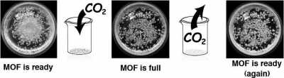 當(dāng)黃色的MOFs晶體內(nèi)充滿(mǎn)二氧化碳后,指示分子就會(huì)變成紅色。