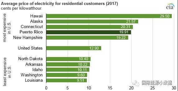 在美國各州中,夏威夷的居民電價最高,達(dá)到29.50美分/千瓦時(約人民幣2.0元/千瓦時);而居民電價最低的是路易斯安那州,為9.51美分/千瓦時(約合人民幣0.65元/千瓦時),與中國居民電價差不多。